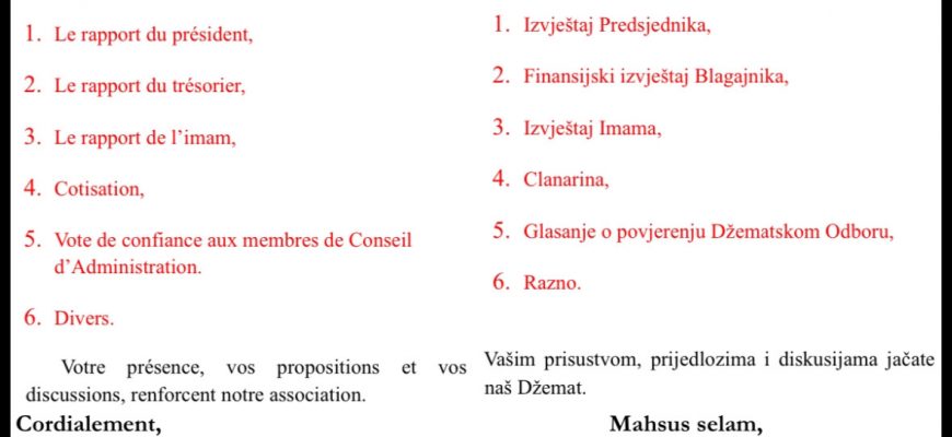 Poštovani članovi džemata Pariz, obavještavamo Vas da Islamska zajedica Bošnjaka u Francuskoj – Džemat Pariz, organizuje Skupštinu džemata.