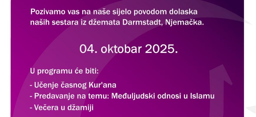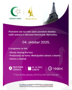 U subotu, 04.10.2025. u prostorijama džemata Paris, a u organizaciji Majki Pariza, posjetiće hanume iz džemata Darmstadt-Njemačka.